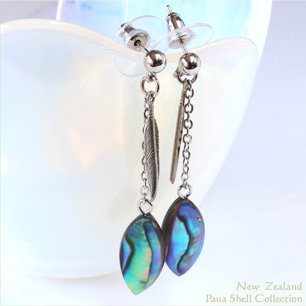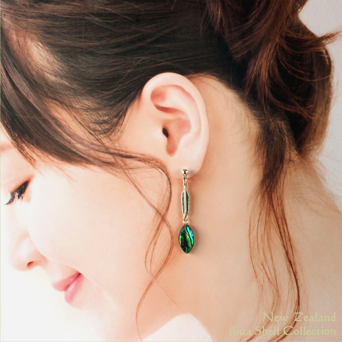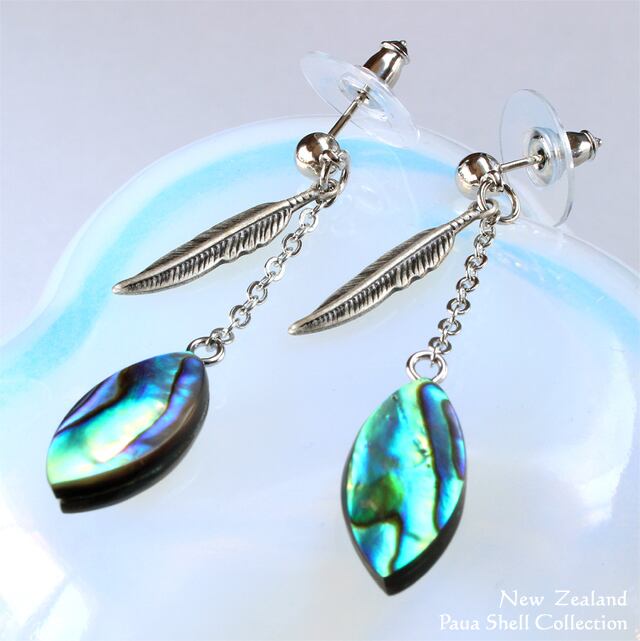 「パウア貝」でつくられたNZ直輸入のお品です。しずく型のモチーフが揺れる繊細なデザイン。