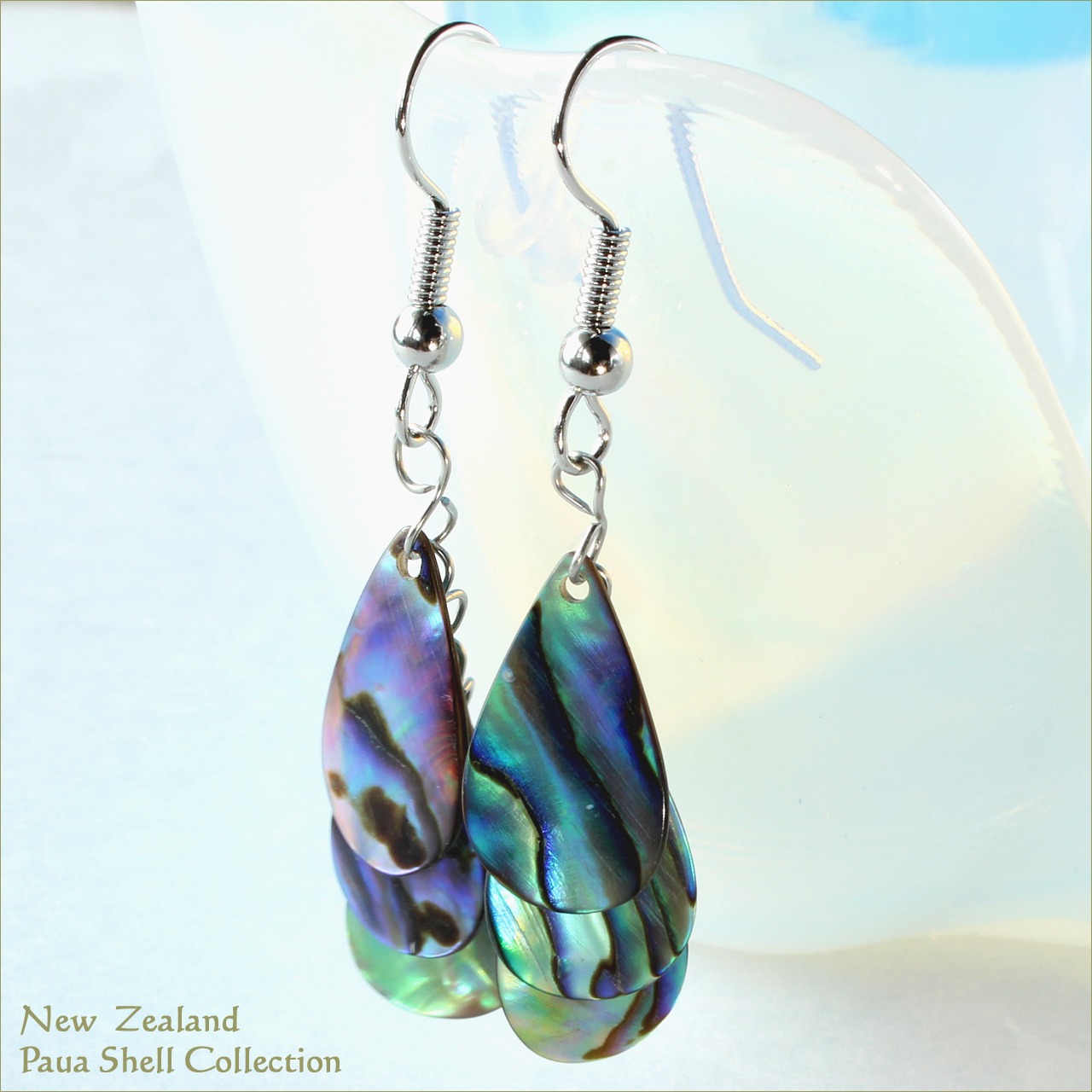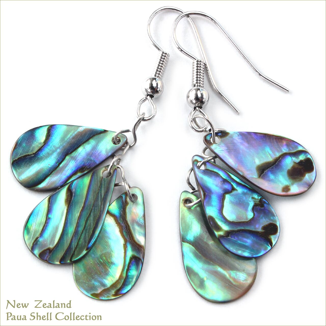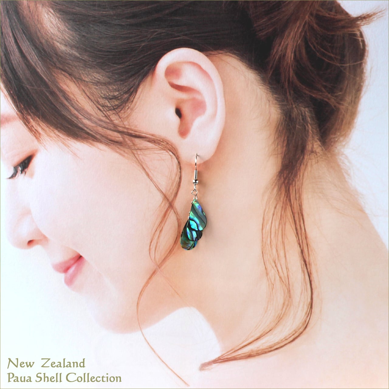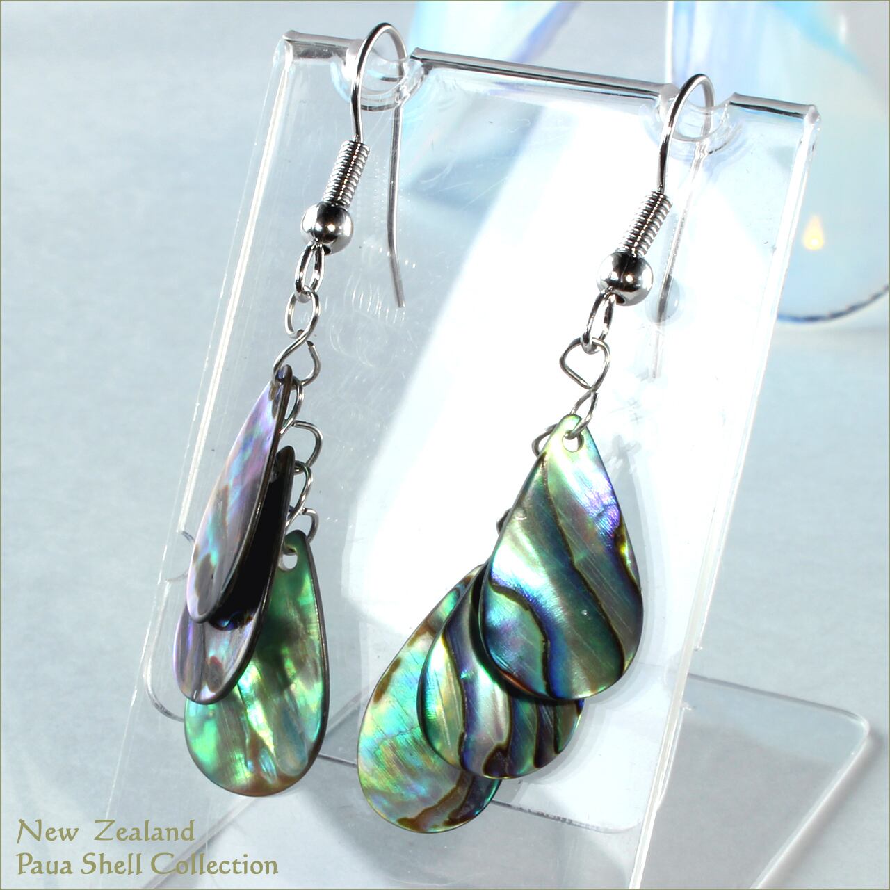 「パウア貝」でつくられたNZ直輸入のお品です。3枚のしずく型モチーフが重なった軽やかなピアスです。風に揺れるとカラカラと涼しい音がします。軽いのもポイント。