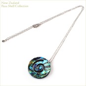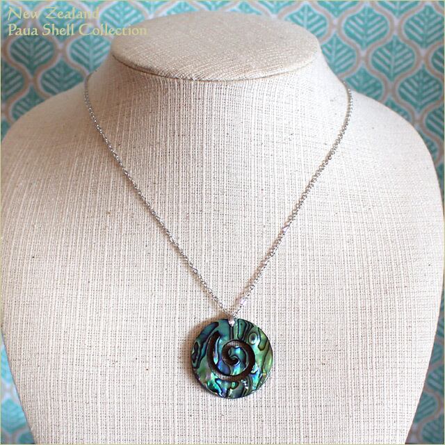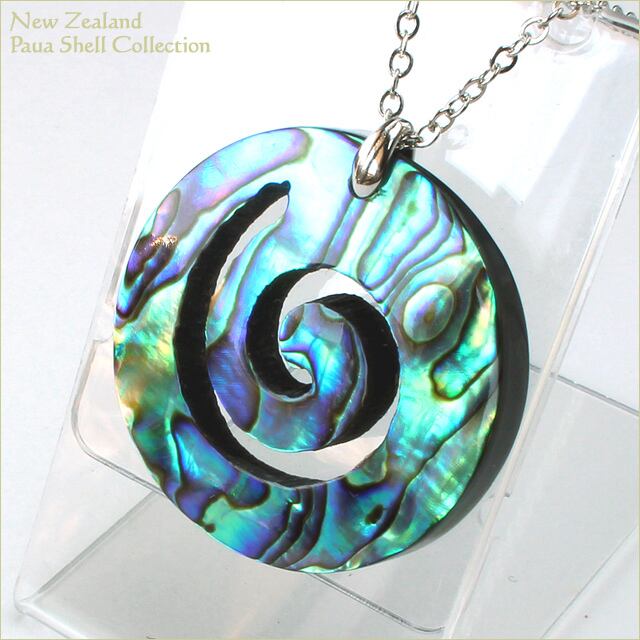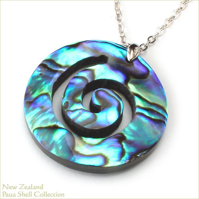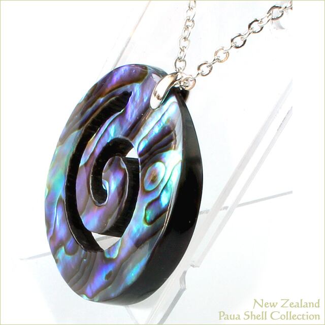海の宝石と言われるニュージーランドパウアシェルの美しい虹彩が大切に生かされたニュージーランドの「パウア貝/PAUA SHELL」で造られた「コル」モチーフのネックレスです。